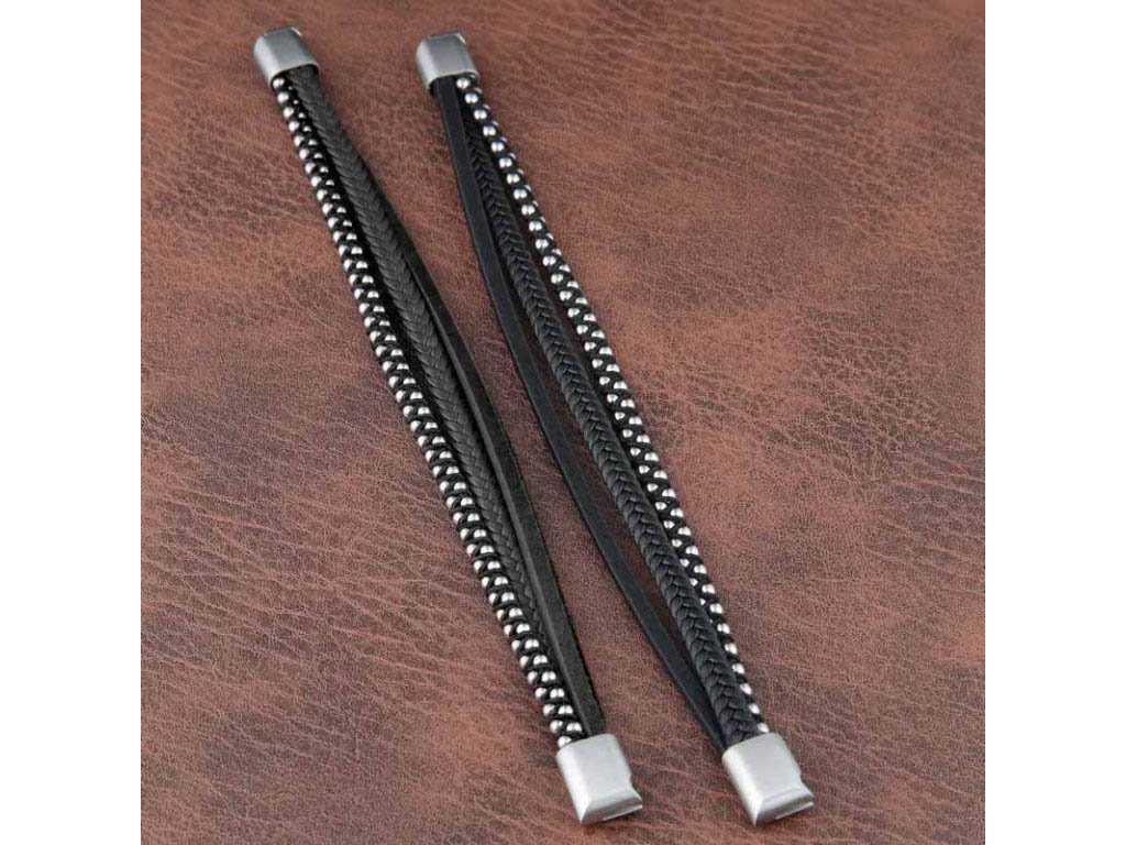 - Na krajoch je jeden kožený remienok s prirodzenou textúrou kože. Druhý má korálky z nerezovej ocele ručne navlečené na pevnú šnúrku tak, že guličky sú v dvoch radoch a vytvárajú cik cak vzor.