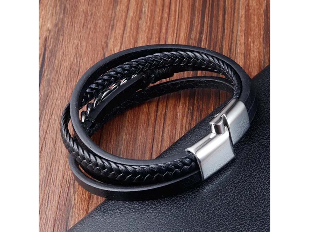 - Korpus náramku tvoria čierne matné kožené prúžky, ktoré sú vzájomne prepletené.