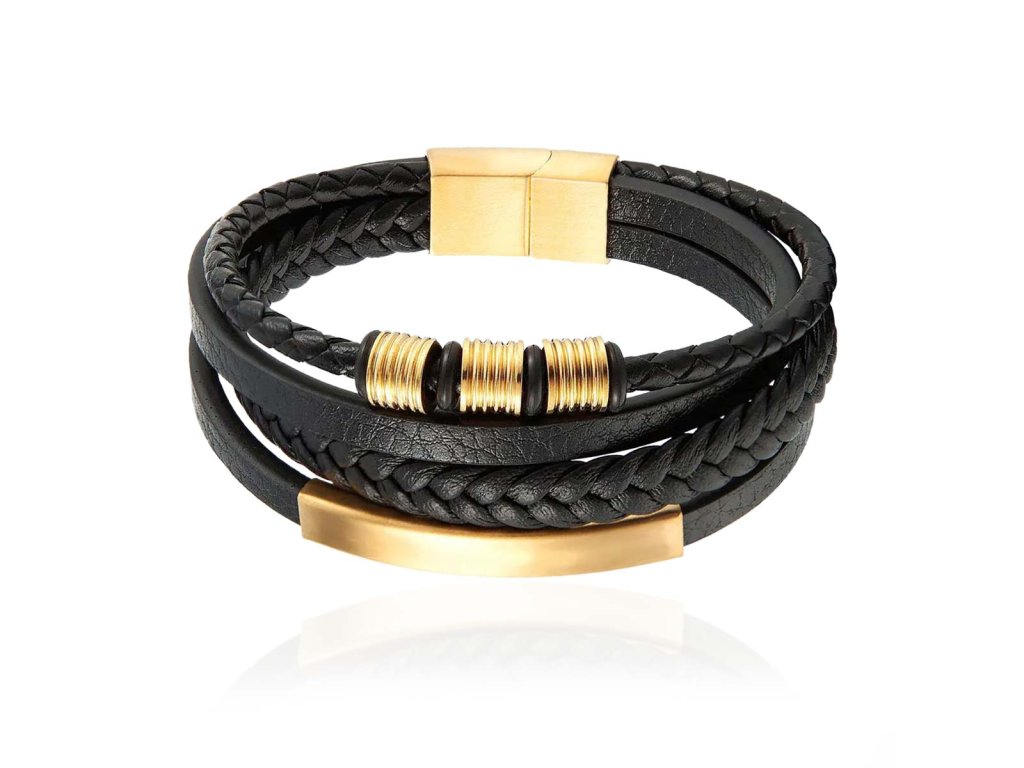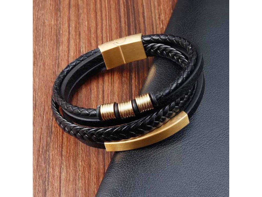- Originálny náramok kombinuje čiernu kožu so zlatou farbou ozdôb a zapínania.