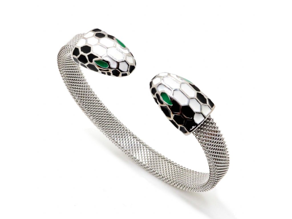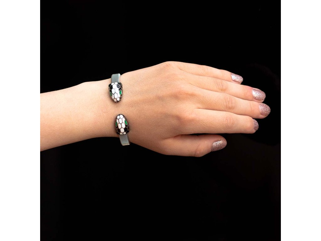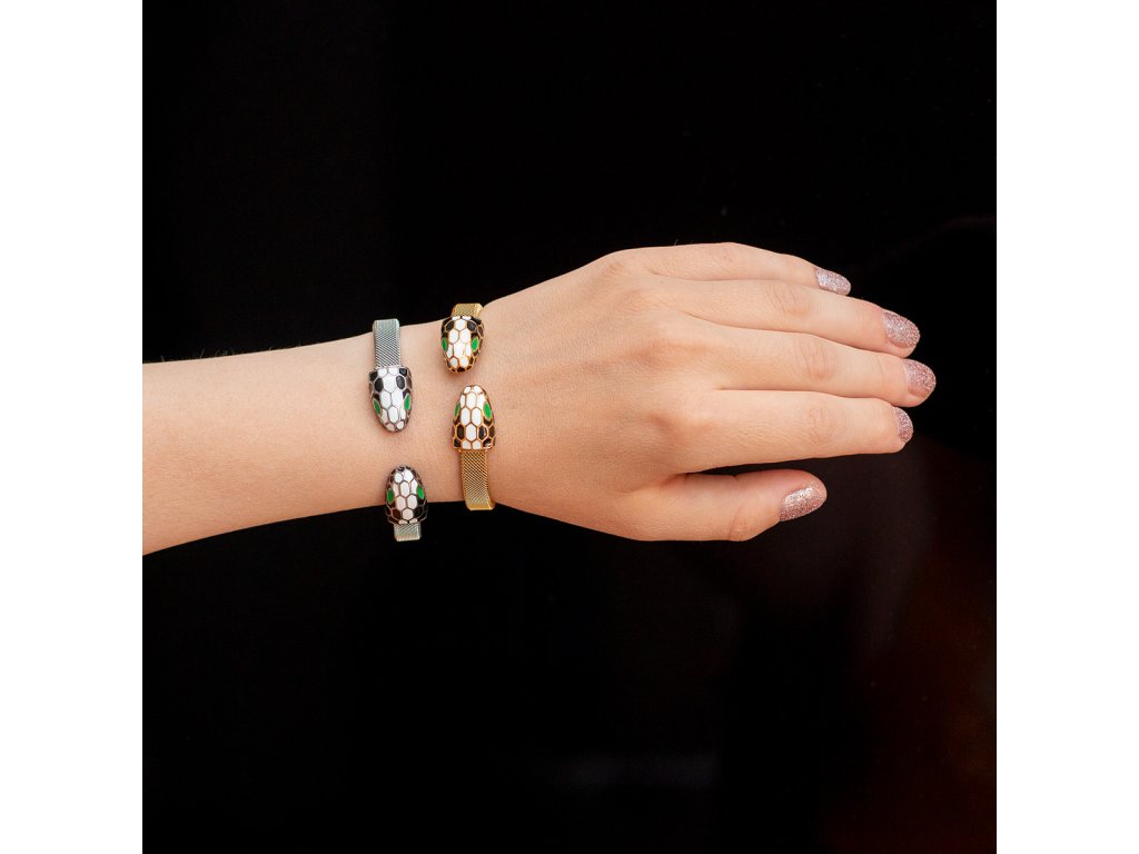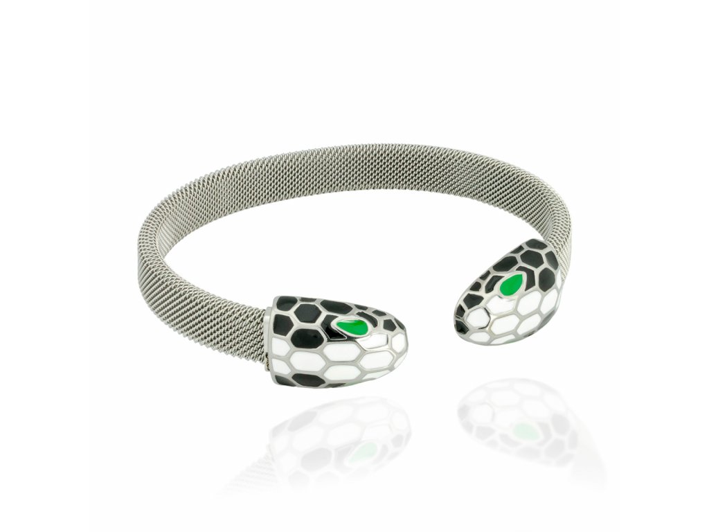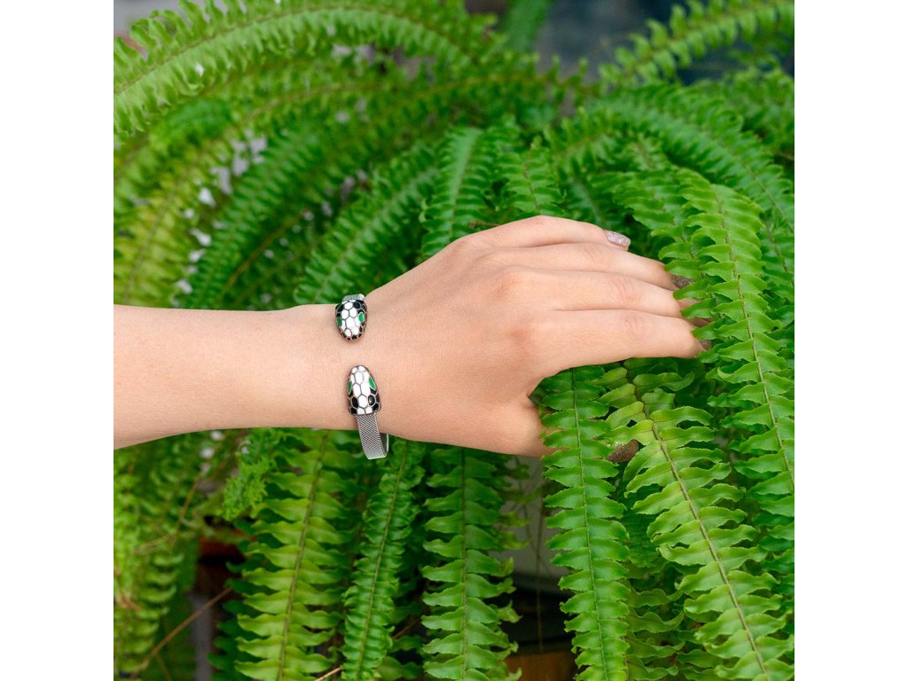 Elegantný oceľový náramok s motívom hada je výrazný a veľmi štýlový. Hadie hlavy sú vyrobené z mozaiky, ktorá kombinuje bielu, zelenú a čiernu glazúru. Táto farebná kombinácia sa k sebe veľmi pekne hodí a v kombinácii s kovovým mriežkovaným pásom vyzerá jednoducho fantasticky. Had je symbolom božstiev, života, múdrosti a liečiteľstva. Je to vznešená postava, ktorá zapôsobí. Odporúčané pre obvod zápästia od 14 cm do 20 cm.