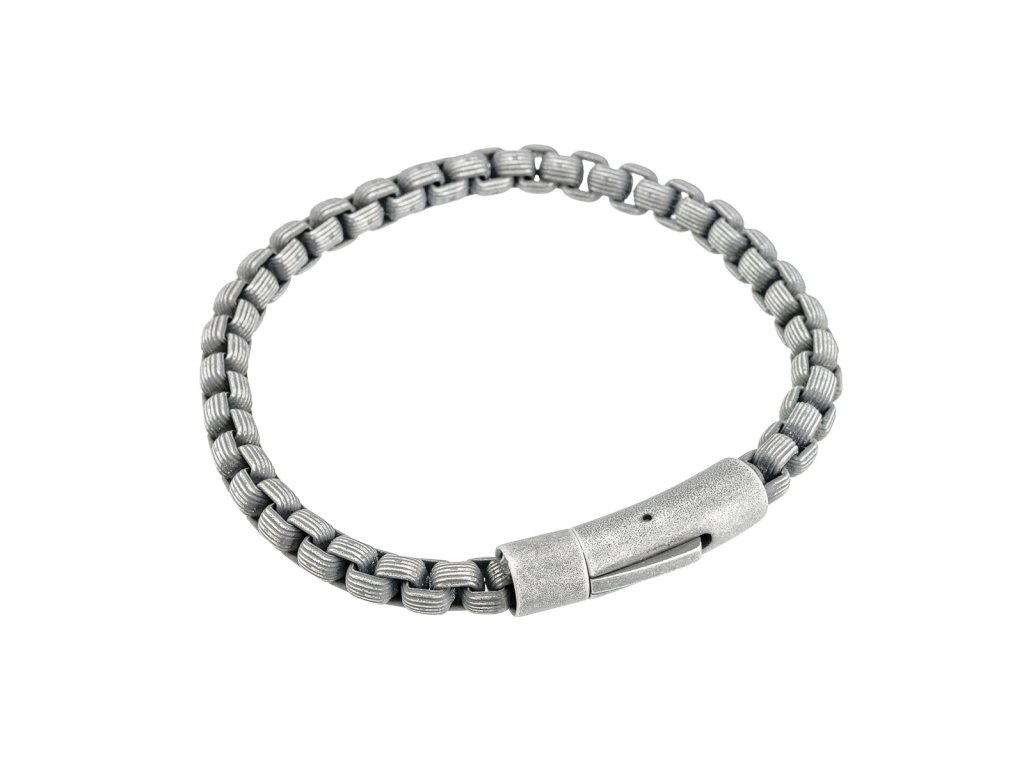 - Oceľ je patinovaná a náramok nie je jednofarebný, ale má rôzne odtiene kovovo lesklej a matnej sivej farby. Prevláda tmavšia farba.