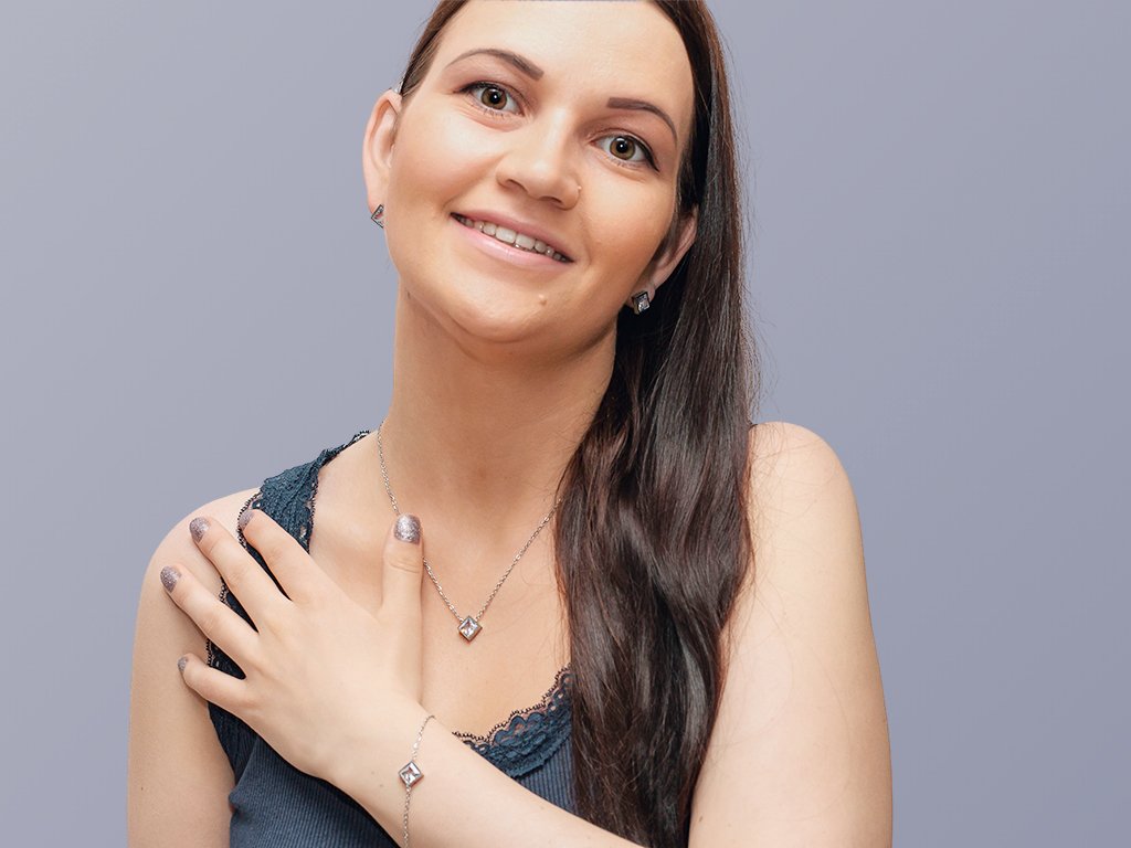 - Hlavným motívom šperkov je štvorec z leštenej ocele so vsadeným kubickým zirkónom.