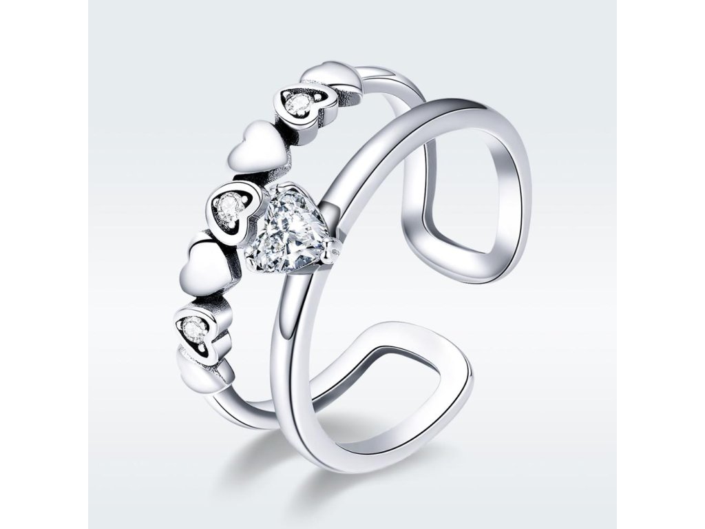 Dva prstene v jednom s milými srdiečkami a jemným dizajnom pre milovníčky klasických romantických motívov. Čím tiež lepšie vyjadriť lásku, než šperkom so srdiečkom. Tento strieborný prsteň je navyše vykladaný tromi zirkónmi v tvare srdiečok a jedným väčším kubickým zirkónom uprostred. Veľkým plusom je to, že ho vyrábame v univerzálnej veľkosti, takže nemusíte premýšľať, aké veľké má partnerka, dcéra či kamarátka prsty.