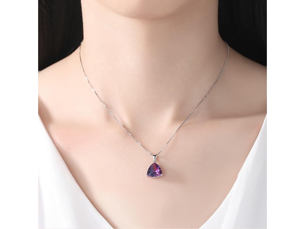 Prekrásny náhrdelník s veľkým kryštálom, ktorý dynamicky mení farby podľa uhla dopadajúceho svetla, vás oslní svojou farebnou paletou, ktorá prechádza od tmavej fialovej cez modrú až po červenú. Strieborné lôžko je po stranách zaujímavo vyryté rôznymi geometrickými tvarmi, ktoré krásne kontrastujú s plnosťou a ostrými líniami krištáľu. Krištáľ je brúsený špeciálnym Trillion cut - triliantovým brusom.