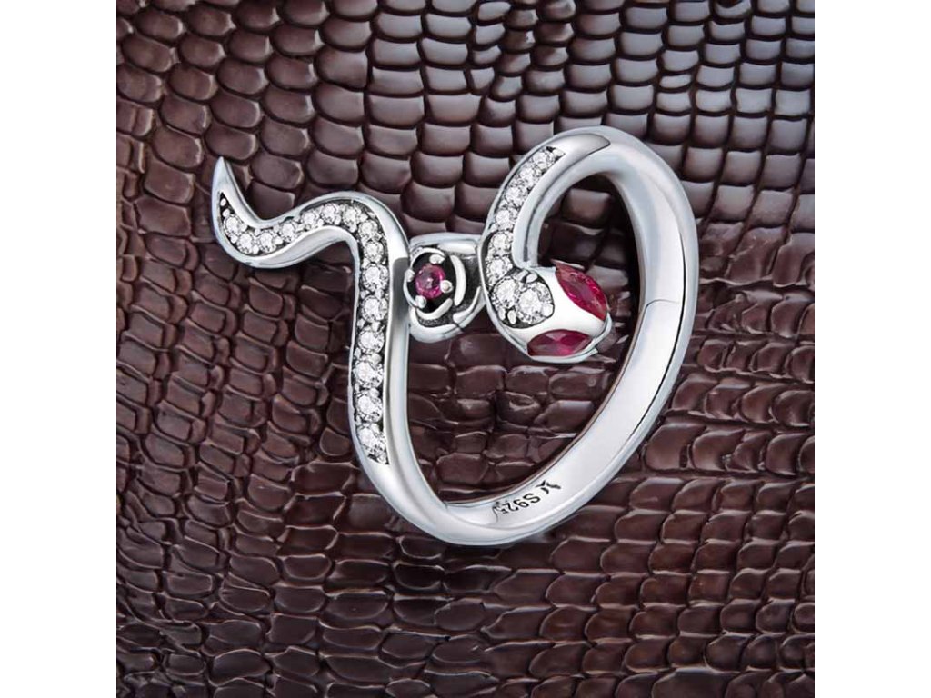 - Hlava je ozdobená dvoma rubínovo červenými kubickými zirkónmi v tvare markízy, ktoré predstavujú hadie oči.